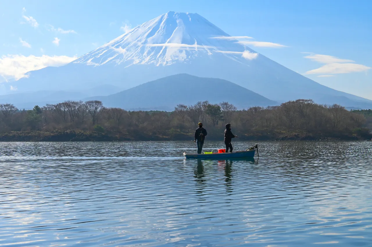 湖面に浮かぶ釣り船から、広がる湖畔の美しい景色とともに釣りを楽しむことができます。釣り船からの眺めは、富士山と湖の絶景とのマッチングが魅力です。